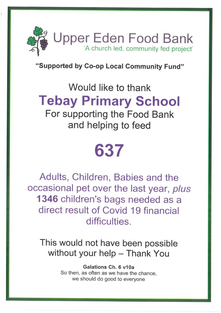 We are delighted to be supporting Upper Eden Food Bank again this year. The ‘bin’ will be left outside school every Tuesday during school hours. The response we had last […]